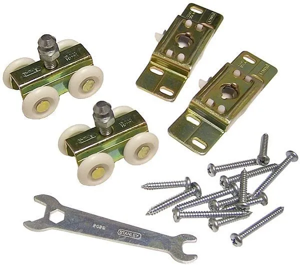 Set Stanley Top Hung Sliding Door Roller for Porta-King Standard (non-bullet resistant) Sliding Door. Includes (1 pair) hanger plates, (1 pair) four-wheel rollers, (1 each) adjustment wrench and fasteners. (approx. 2 pound shipping weight per set)